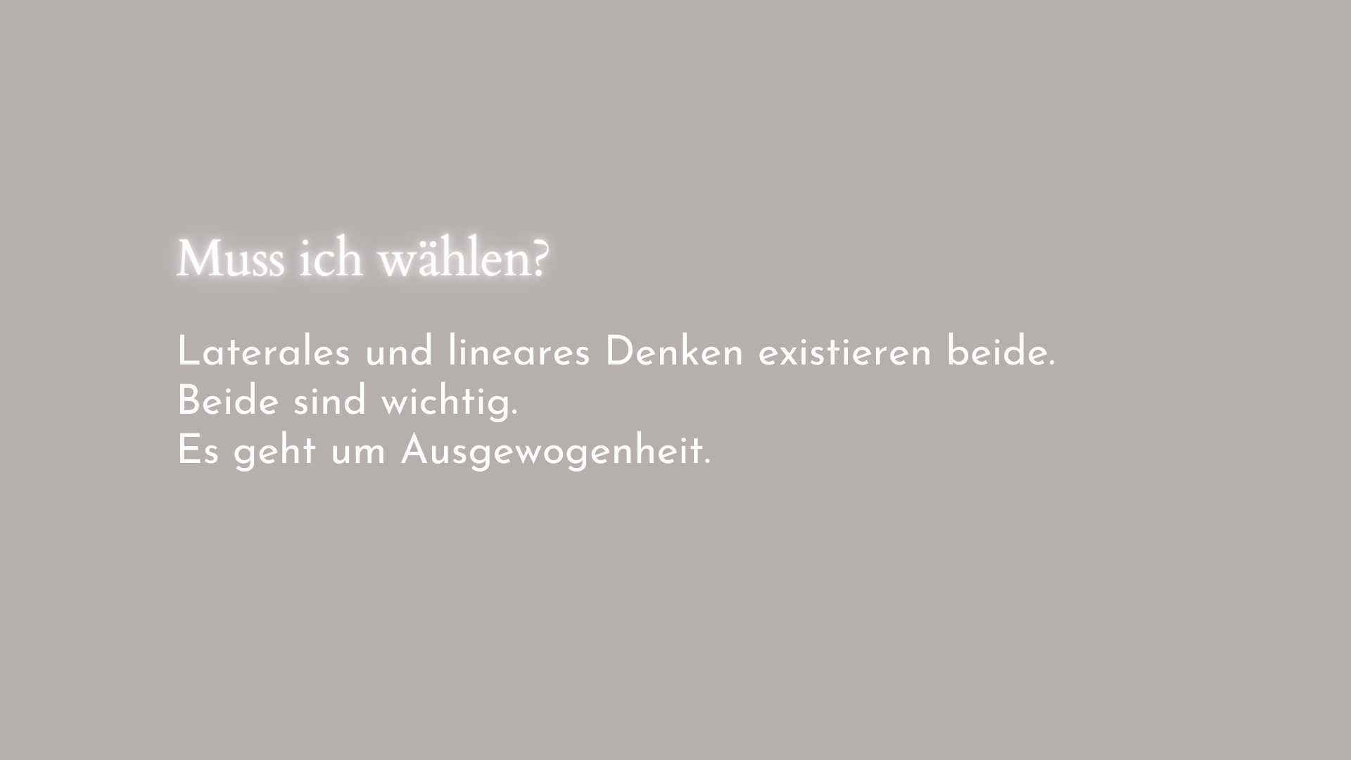 Eines ist wichtig: es geht nicht darum, sich für eine Art des Denkens zu entscheiden. Laterales und lineares Denken existieren beide und beide sind wichtig. Es geht um Ausgewogenheit.